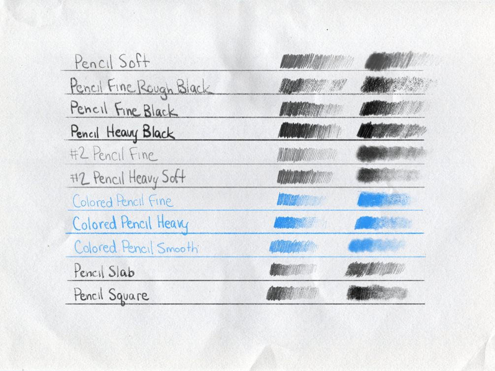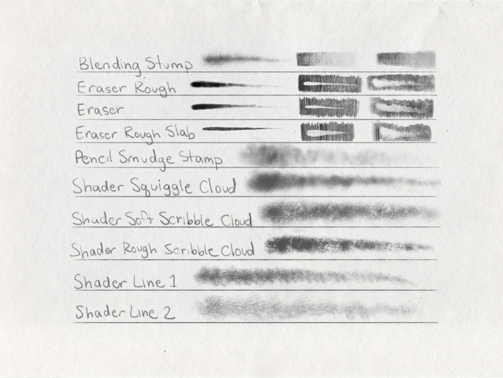 You'll get a ZIP file containing 11 pencil brushes, 3 erasers, 1 Blending Stump, 1 Hand Smudge Stamp, and 5 shaders - PLUS a ZIP file containing 5 high-resolution paper textures